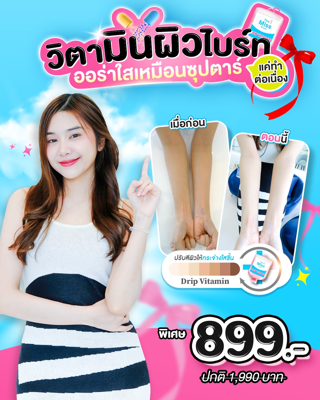 ดริปวิตามินผิว หัตถการกอบกู้ผิวทั่วทั้งร่างกายให้ดูเปล่งปลั่ง สวยใส มีออร่าน่ามองที่ได้รับความนิยมติดต่อกันนานหลายปีและในปัจจุบันยังมีการพัฒนาสูตรดริปวิตามินผิวออกมาให้เลือกหลายสูตร ไม่ว่าจะเป็นการดริปวิตามินผิวสูตรบูสต์ผิวกระจ่างใส ลดปัญหาผิวหมองคล้ำ ดริปวิตามินผิวสูตรออร่า ดริปวิตามินสูตรเข้มข้น เพื่อการดูแลผิวอย่างล้ำลึกรวมไปจนถึงสูตรดริปวิตามินที่ช่วยฟื้นบำรุงร่างกาย และส่งเสริมการทำงานของระบบภูมิคุ้มกันให้แข็งแรงมากยิ่งขึ้น