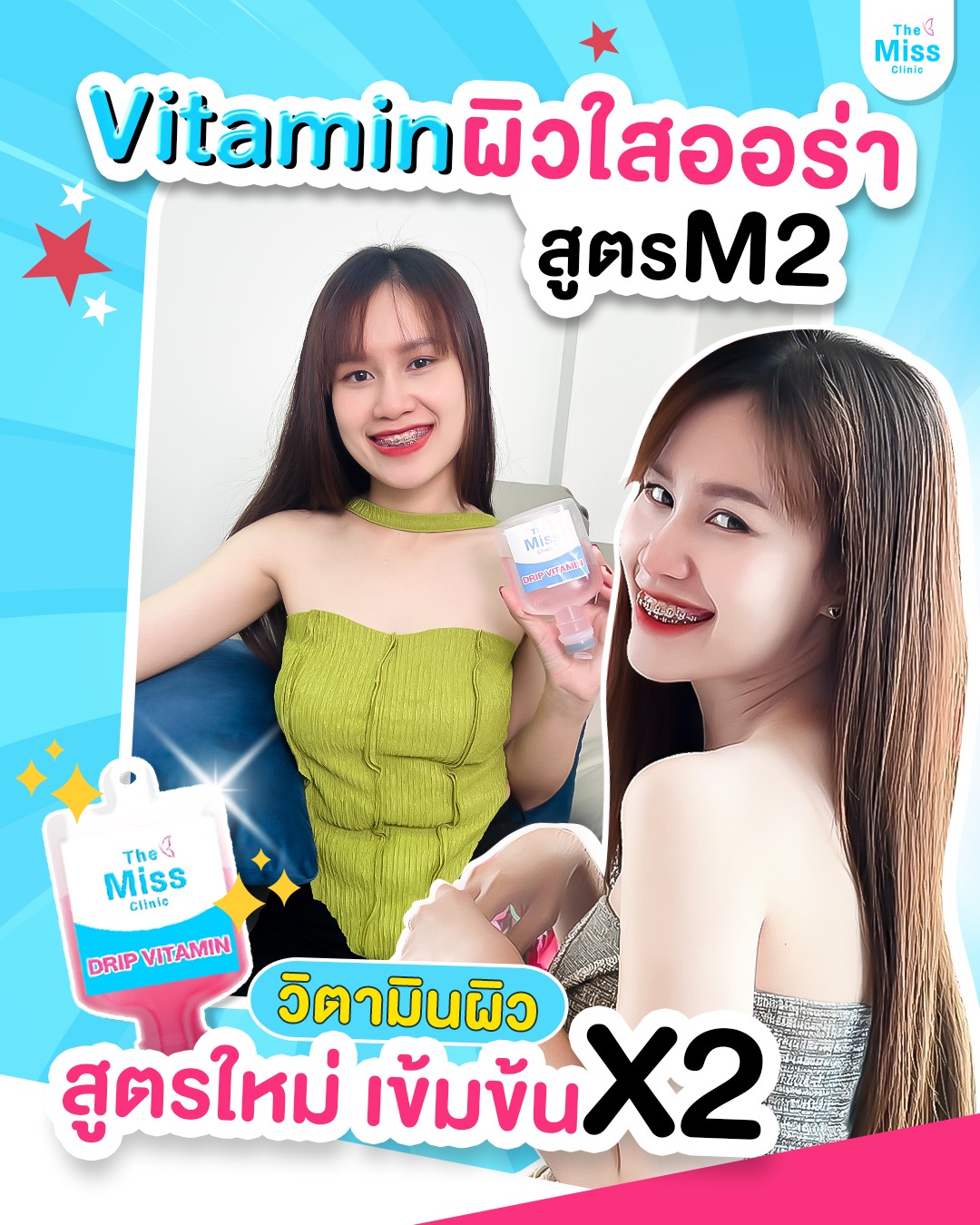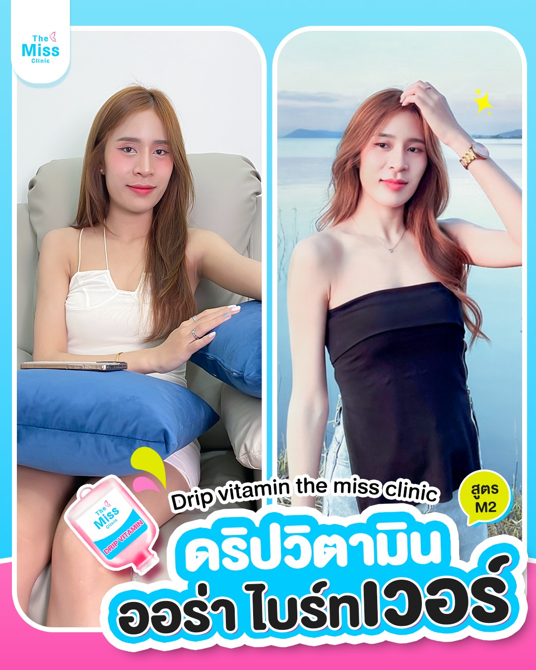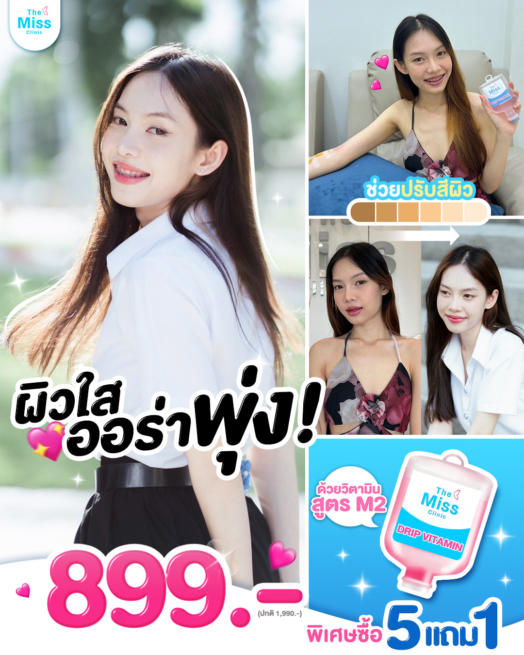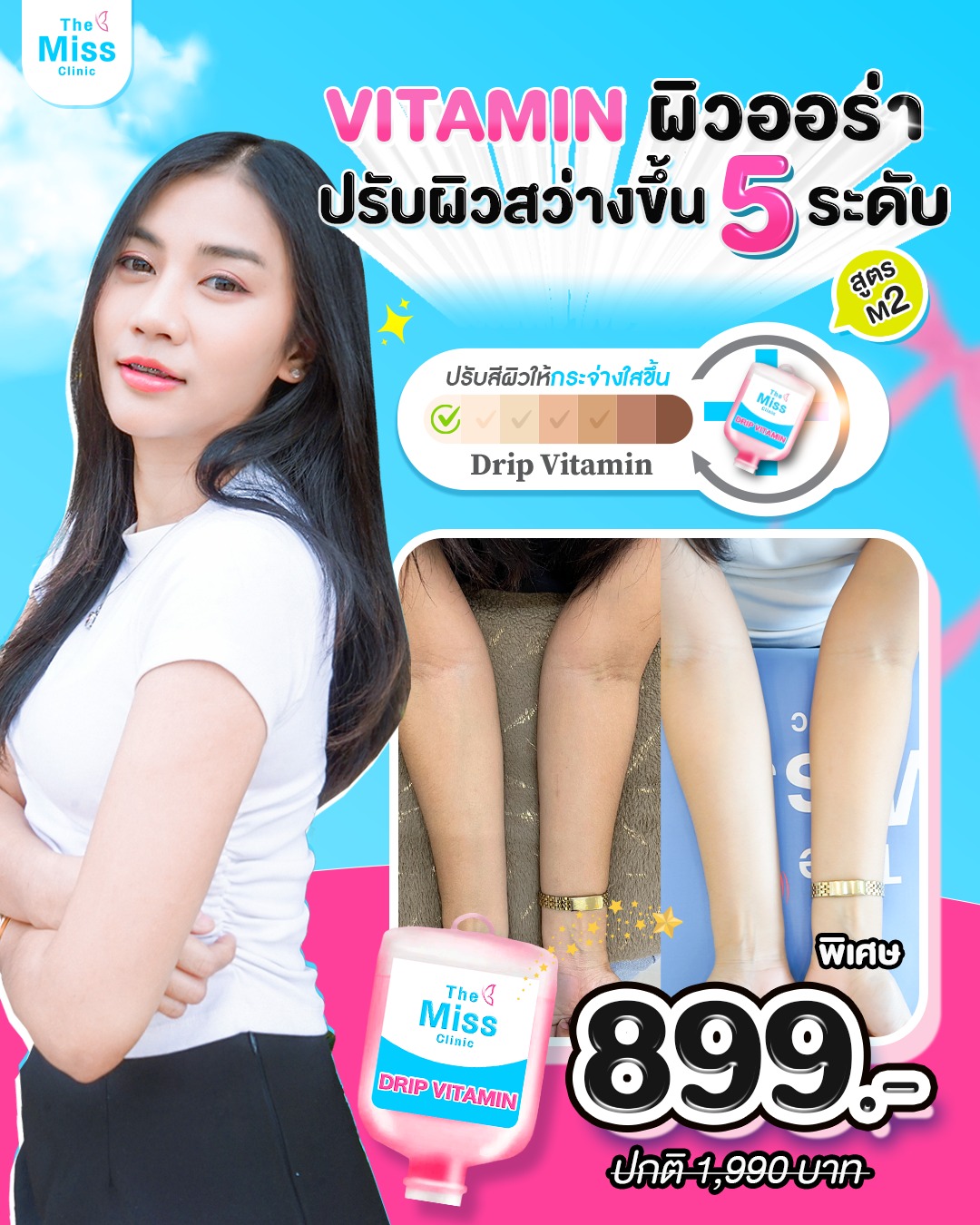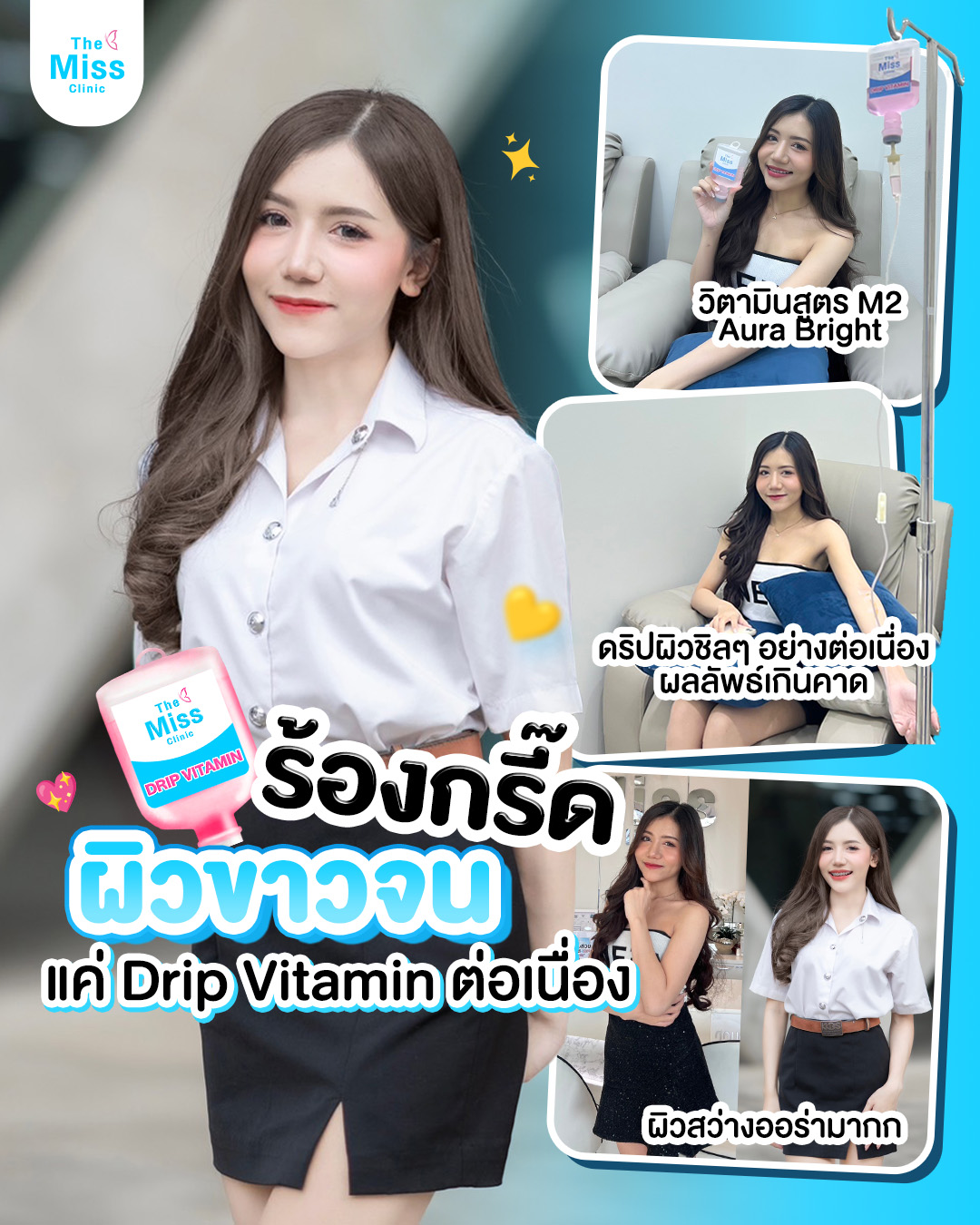 สนใจดริปวิตามินผิวด้วยสูตรตัวยาที่ปลอดภัย ผ่านการรับรองมาตรฐาน อย. ดูแลทุกเคสโดยแพทย์ผู้เชี่ยวชาญ สามารถเข้ามาปรึกษาแพทย์ได้ที่ The Miss Clinic หรือแอดไลน์ @themiss เพื่อสอบถามข้อมูล โปรโมชั่น หรือดูรีวิวดริปวิตามินผิว ได้เลยค่ะ เรายินดีให้คำปรึกษา และประเมินสภาพผิวโดยละเอียด ก่อนเริ่มขั้นตอนการดริปวิตามินผิว ให้คุณมั่นใจได้ในทุกขั้นตอน